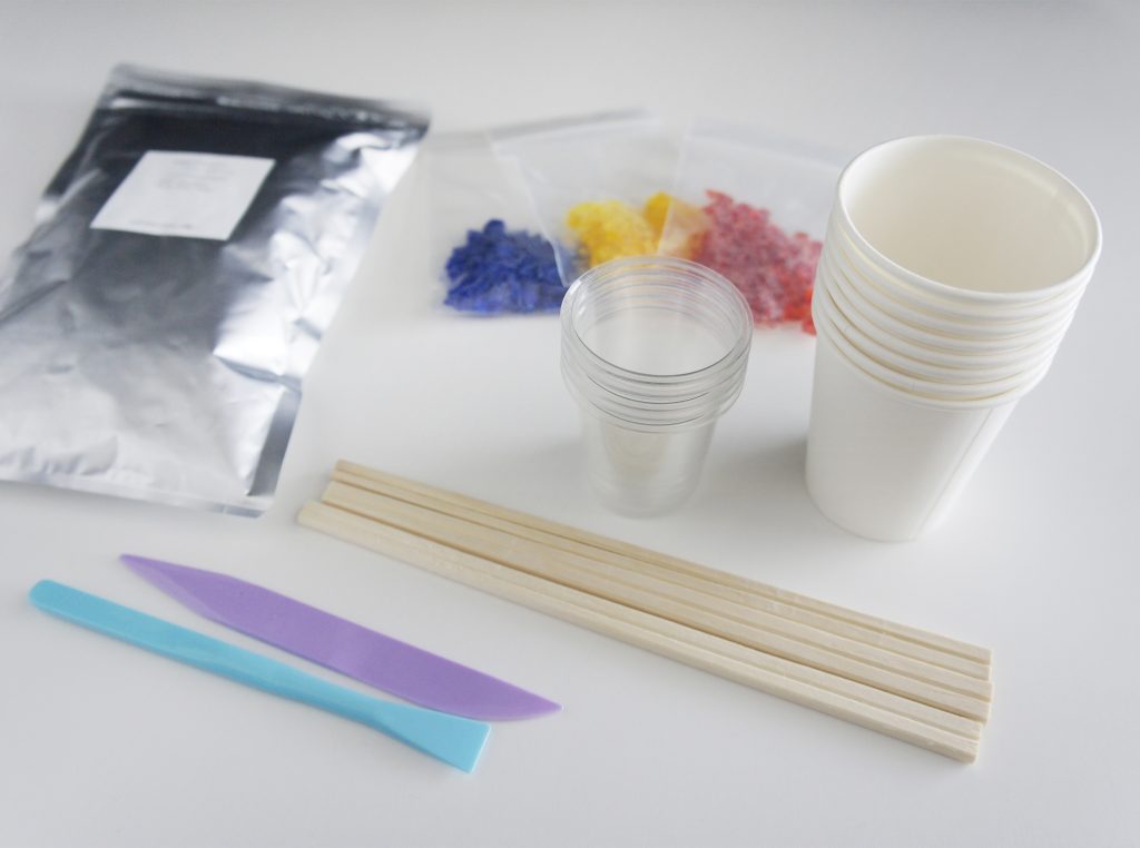 紙コップとプラコップ、かき混ぜる用の割り箸、形を整える用の粘土ベラなどがあるとよい。