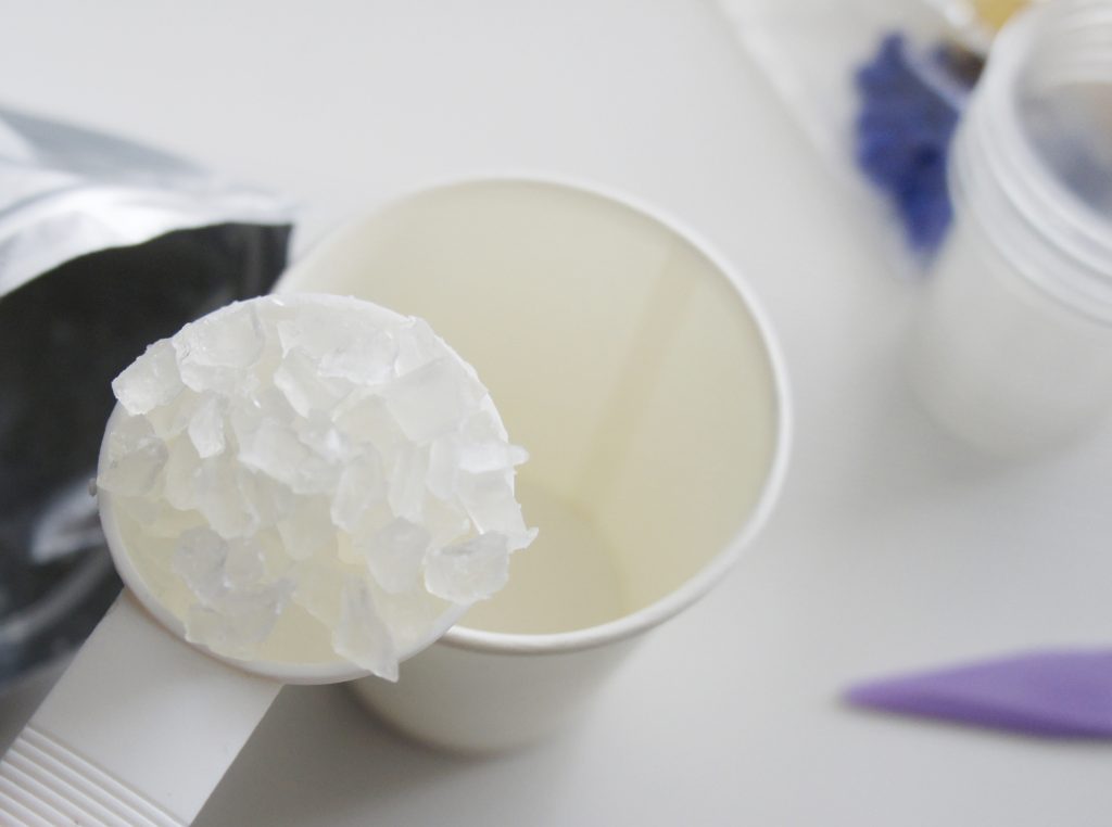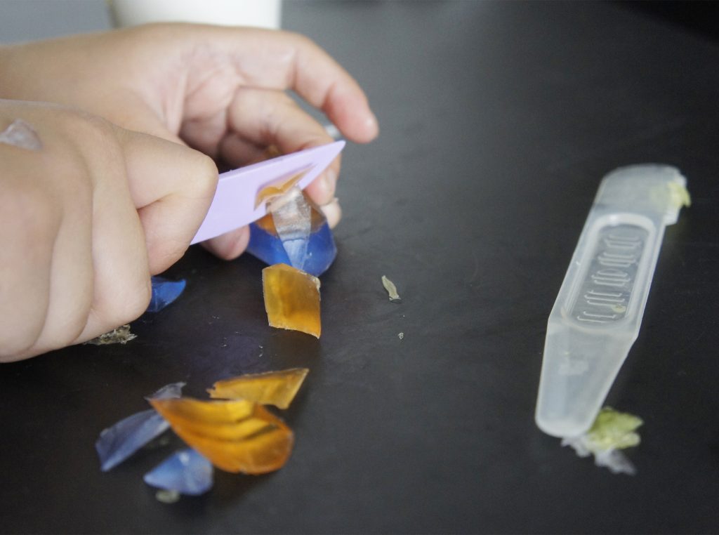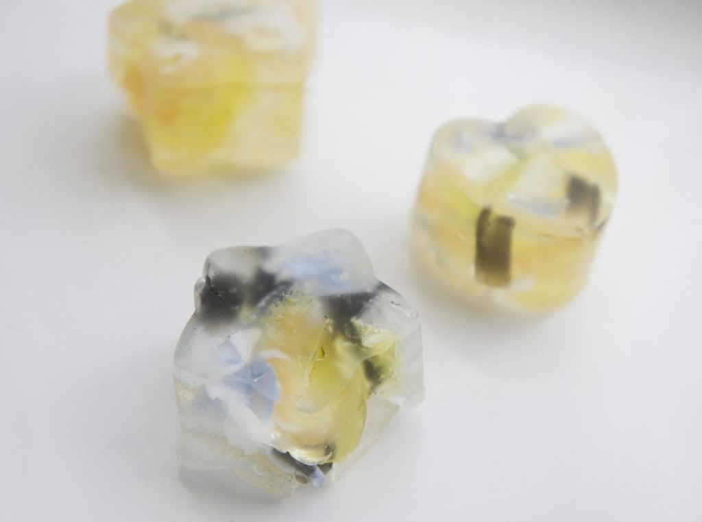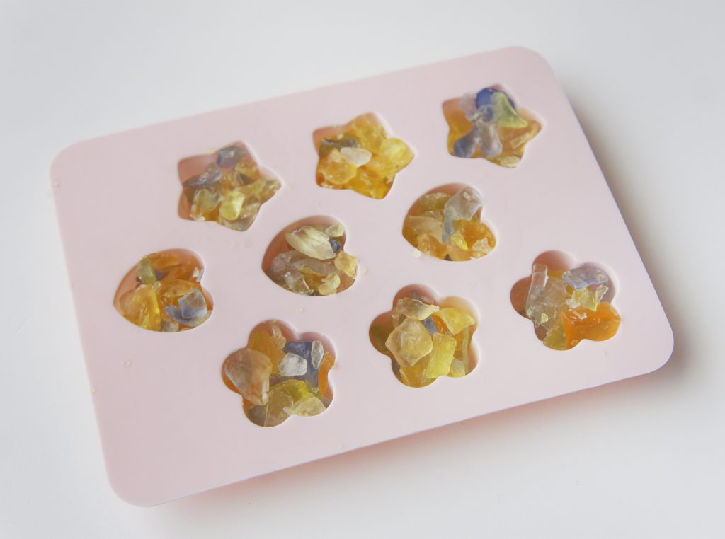 削ったカケラはシリコンカップなどに入れて、溶かしたクリアソープを隙間に入れて固めたら、